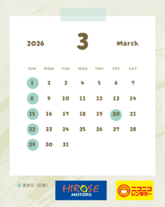 3月営業日カレンダー - 広瀬モータース 別府 | 新車 中古車 軽自動車 車検整備 鈑金 塗装 カスタマイズ